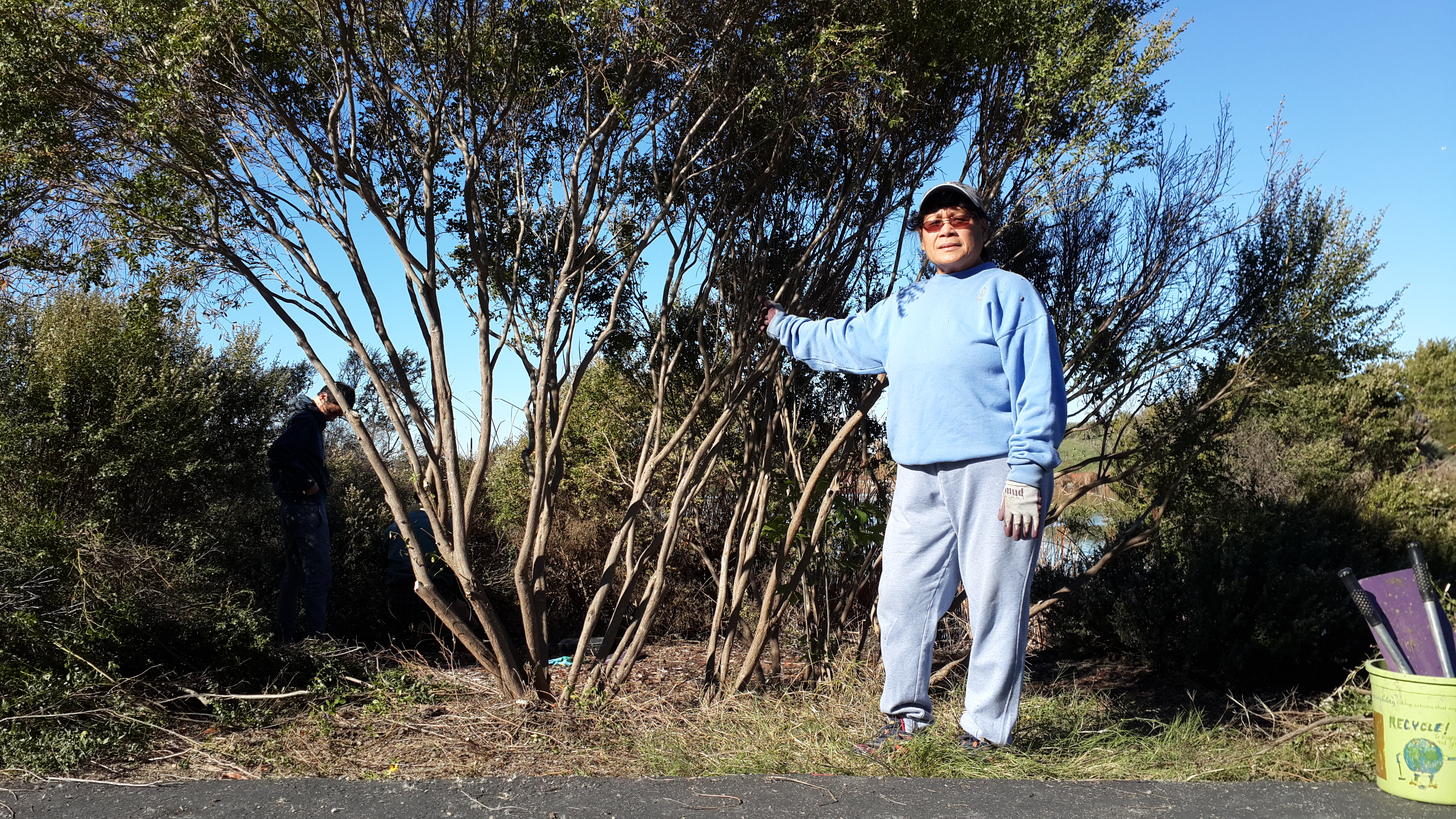 Fran worked on pruning this coyote bush next to the lakeside path